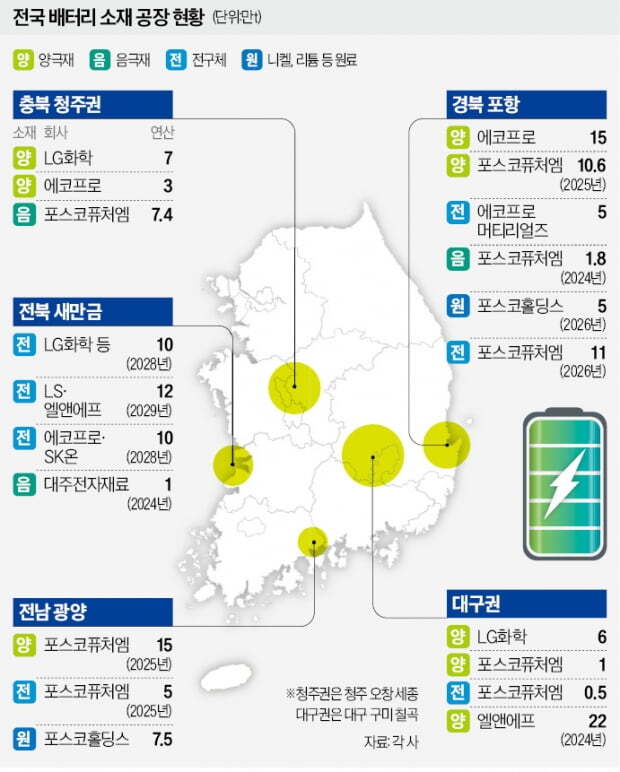 LG화학 충북 청주에 새양극재 공장부지 검토. 에코프로 청주에 연구개발캠퍼스 조성 추진. 앨엔에프는 대구권 중심으로 투자. 새만금은 배터리 소재 클러스트로 떠오름.
