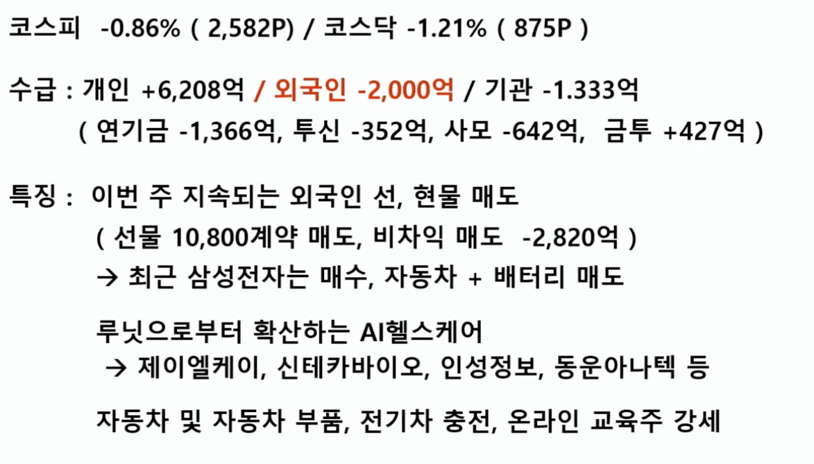 외국인 투자자들이 최근 주식을 다 팔고 있음. 반도체 업황 개선 기대감이 확산하자 삼성전자와 SK하이닉스 집중 매수. 최근 외국인의 주식매도는 단기 과열 인식에 따른 차익 실현 성격. 외국인은 반도체 턴어라운드 가능성에 주목하고 2차 전지와 자동차 산업을 긍정적.