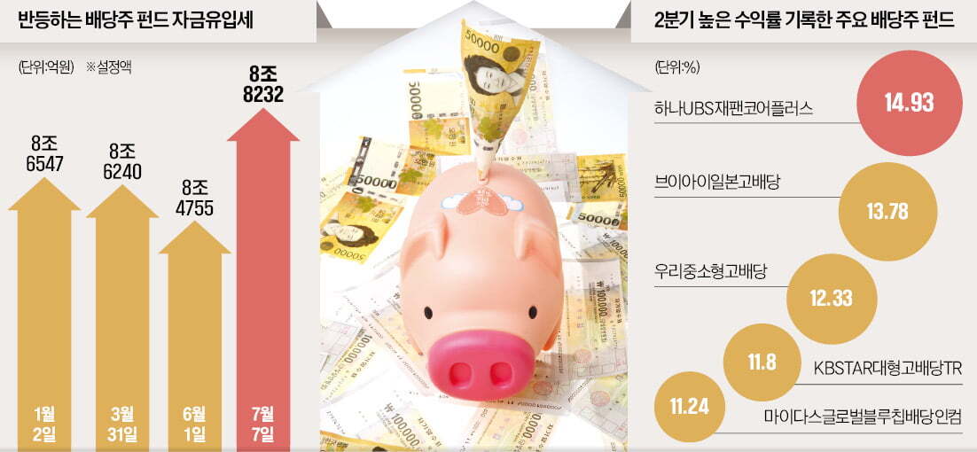 고배당주에 집중적으로 투자하는 배당주펀드에 ‘뭉칫돈’이 몰리고 있다. 전체 증시가 미국 중앙은행(Fed)의 추가 금리 인상 등으로 주춤하는 사이 배당주펀드가 상대적으로 높은 수익률을 내
