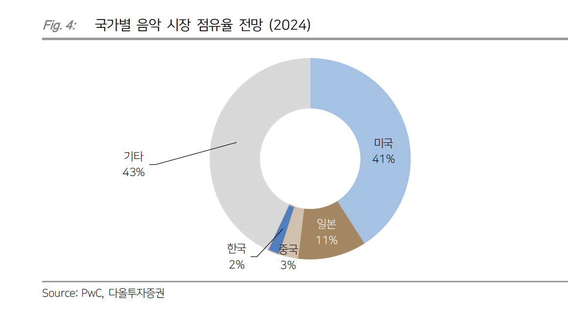 국내 엔터사들은 2000년대부터 일본을 비롯한 아시아 시장에 진출해 풍부한 경험을 쌓아 왔습니다. 특히 일본에서는 현지 아이돌을 데뷔시켰고, 향후에도 현지 아이돌 육성을 계속될 전망입니다. 반면에 아직 미국에서는 일본 시장만큼 깊이 침투하지는 못했습니다. 하지만, 미국 음악시장 규모가 일본의 4배에 이른다는 것을 감안하면 미국 시장의 성장여력은 충분할 것 같습니다.