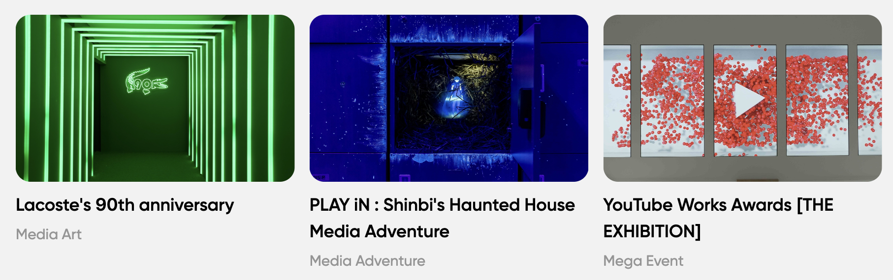 제일기획, 대홍기획, 삼성전자, CJ E&M, 현대차, 구글(유튜브), 디즈니, 대우건설, DL E&C 등 글로벌 기업들을 원청으로하는 실감미디어 콘텐츠를 납품하고 있습니다. 옥외 전광판, 영상 AR콘텐츠 등의 콘텐츠 납품뿐만 아니라 메가 이벤트 연출 및 운영, 실감미디어 테마파크 구축까지 전방위적으로 실감미디어 서비스를 제공하고 있습니다.