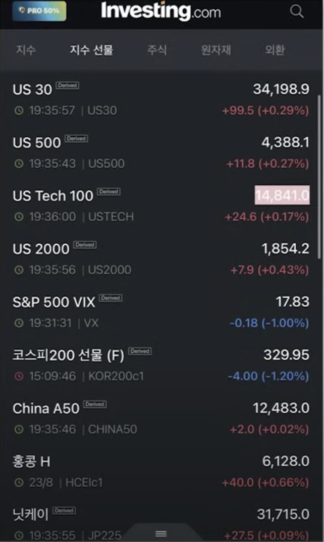 ◼︎ 새벽, 장 시작 전에 인베스팅닷컴을 통해 미국 증시에 선물상황을 파악, 코스피 200 선물 꼭 체크