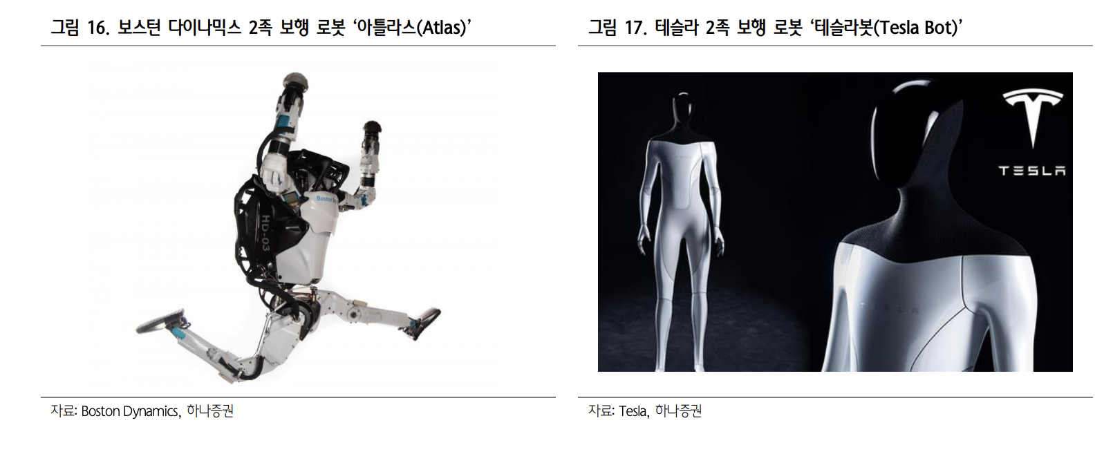 2족 보행 로봇 (휴머노이드)는 테슬라가 2023년 테슬라봇 시제품을 생산 준비를 완료할 것이라고 발표했습니다. 휴머노이드는 사람 형태의 로봇으로 위험성이 높거나 반복적인 일들을 대시하기 위해 개발되었습니다. 2족 4족 보행 로봇은 산업용, 연구용 로봇에서 방산산업까지 확대되었습니다. 미국 방산업체 고스트로보틱스에서 저격 소총을 장착한 4족 보행 로봇을 공개했고, 국내에서도 현대로템과 레인보우로보틱스가 방산용 다족보행 로봇을 위한 연구 개발을 진행중입니다.