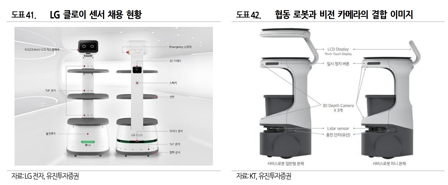 카메라와 힘/토크 센서는 로봇에게 시각과 촉각을 부여하는 인간의 감각기관과 유사한 기능을 제공하는 부품으로 로봇이 고도화되기 위해 필요한 부품입니다. 카메라 센서의 경우 서빙 로봇, 배송 로봇, 물류 로봇 등에 다수 채용되고 있는데, 서빙로봇에는 통상 3개 내외, 배송 로봇에는 10개 내외의 카메라 센서가 내장되고 있습니다. 그리고, 산업용 로봇 또는 협동 로봇과도 결합되어 물류작업 등 더욱 폭넓은 작업을 수행할 수 있게 해 줍니다. 앞으로 실내외 자율주행 로봇 시장과 산업용 로봇의 용도 다변화와 함께 로봇용 카메라 센서 시장 규모가 확대할 것이라고 기대하고 있습니다.