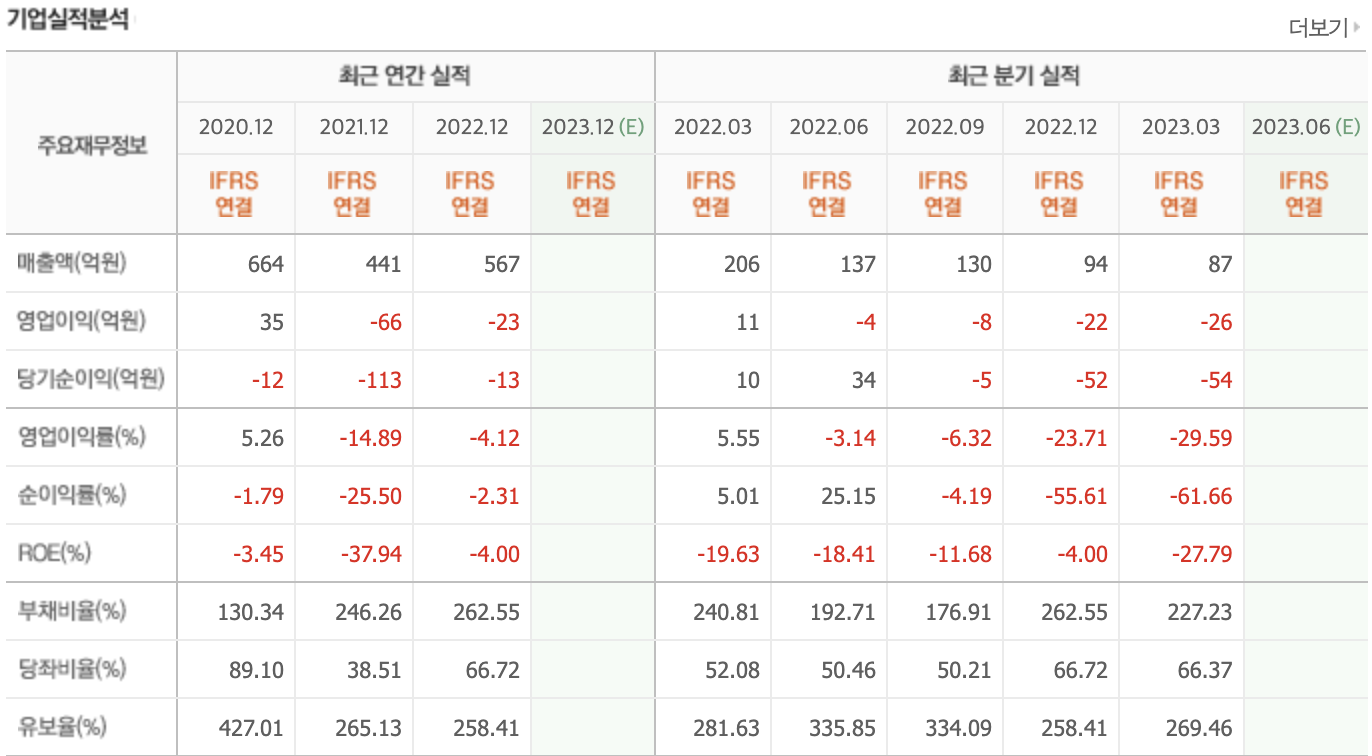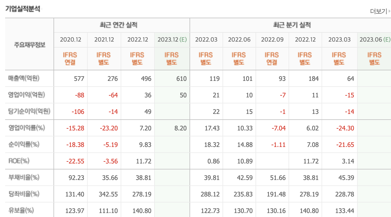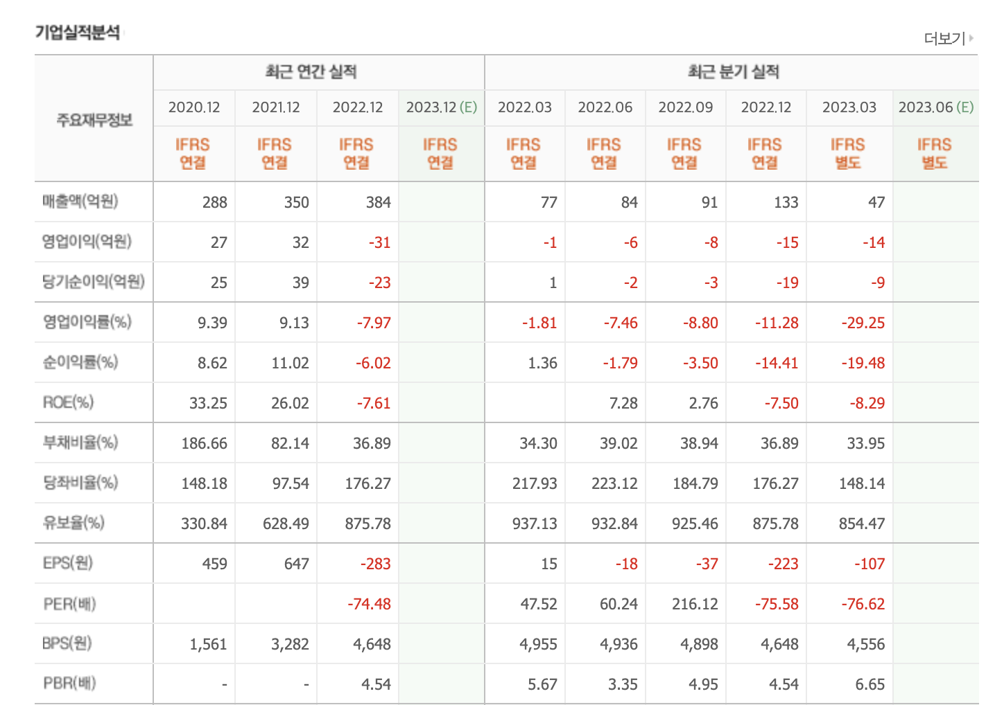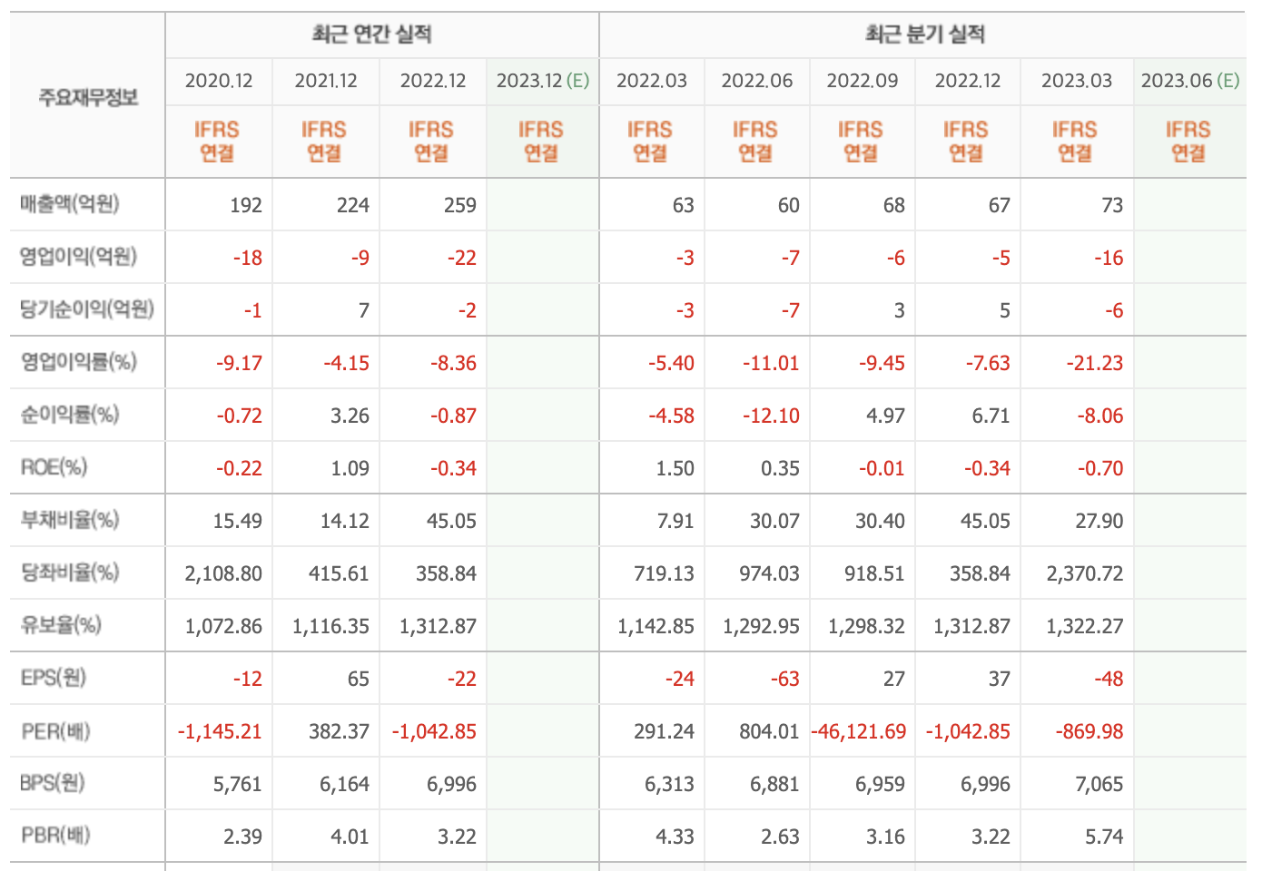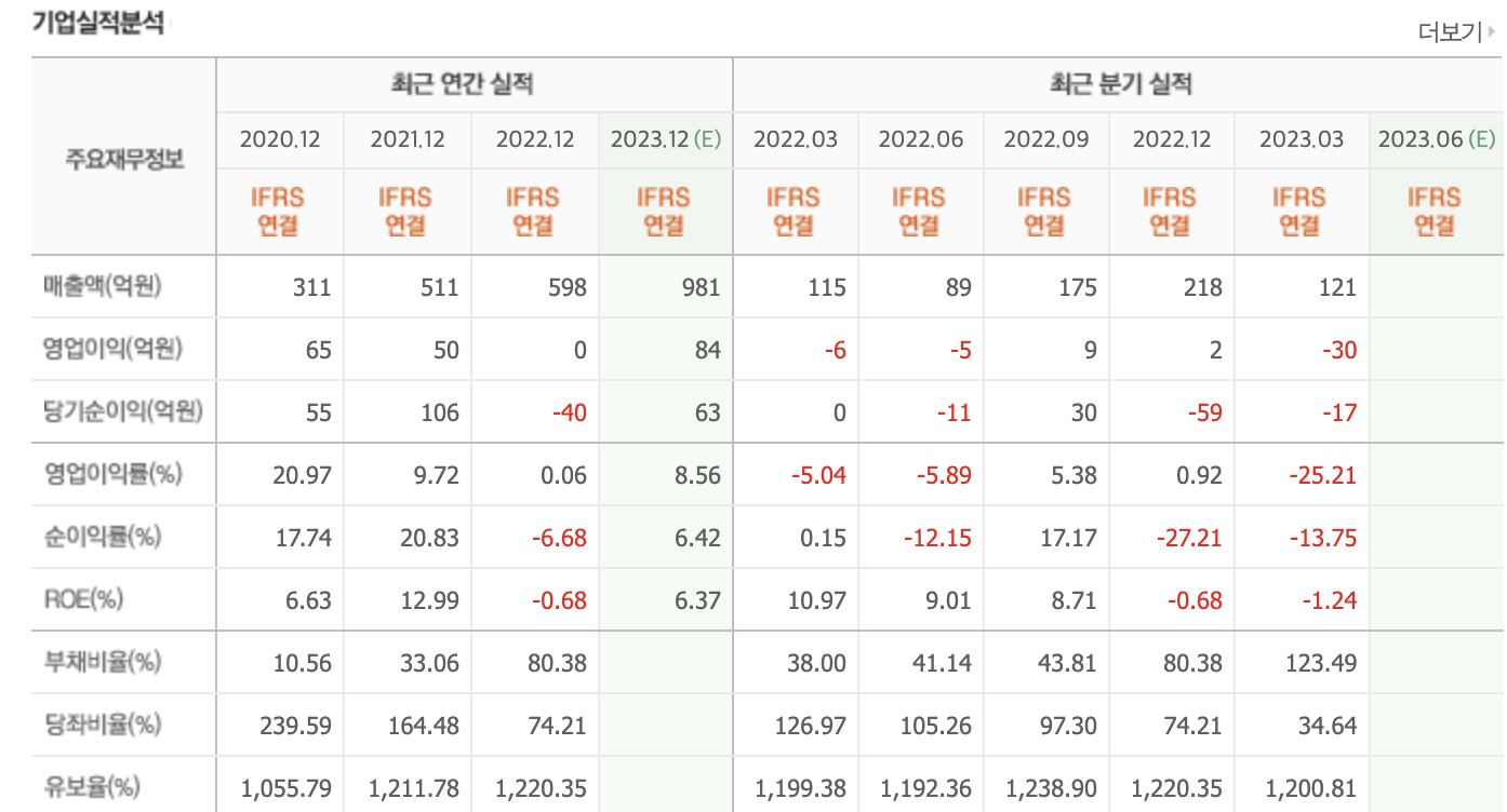 재무제표를 보면 부채비율이 20%에 불과해 재무건전성은 우수하나 22년 3분기 만에 흑자전환했고, 영업이익은 2억에 불과합니다.