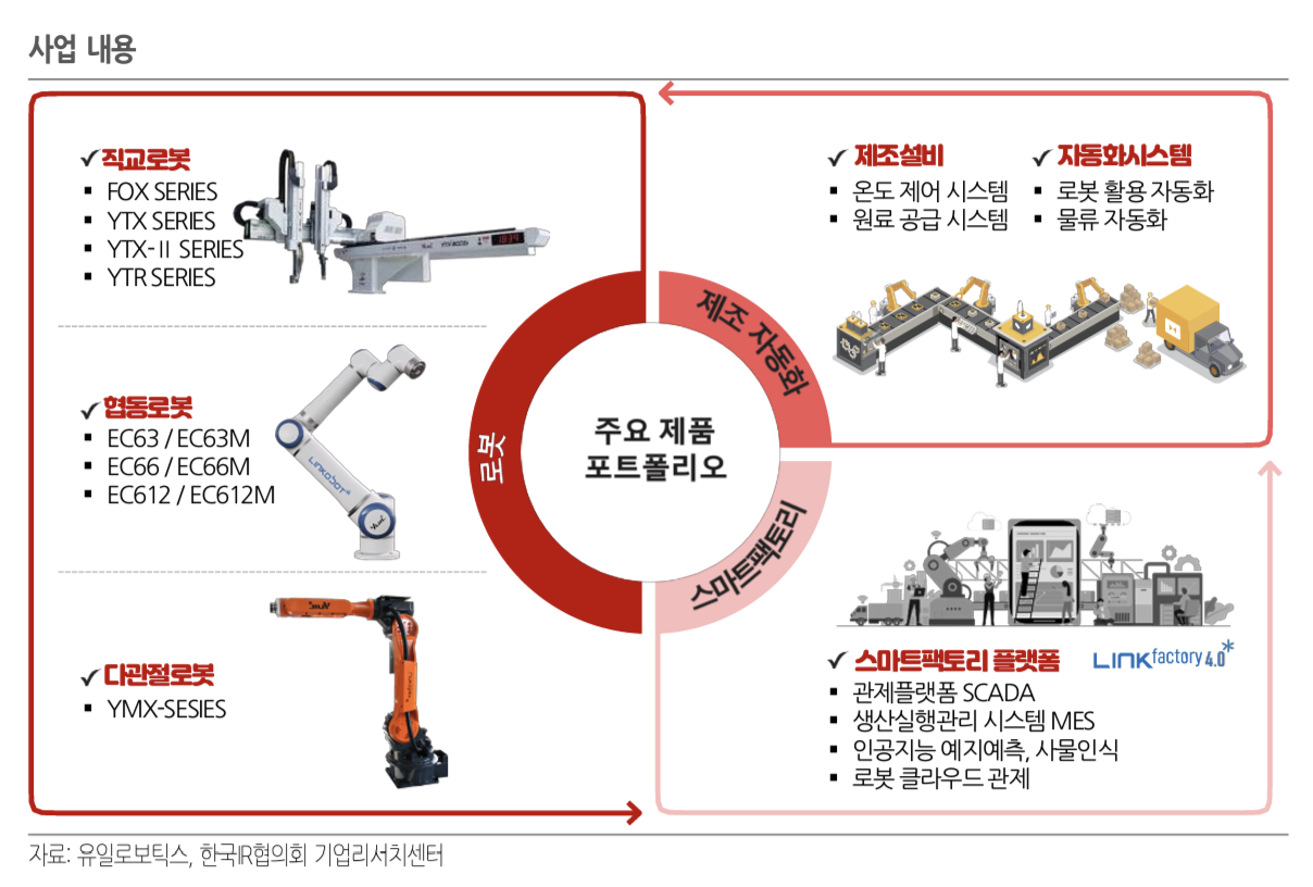 산업용 로봇으로는 가장 기본적인 직교로봇, 다관절로봇, 협동로봇 등을 개발하였고 고도화 및 스마트 팩토리 구현을 위해 Linkbot과 Link-factory 4.0 설루션을 연구개발하고 있어서 정부 정책 수혜주로 분류할 수 있습니다. 최근에 2023 정부지원 서비스로봇 실증사업에 로봇공급기업으로 선정되었다고 밝혔습니다.