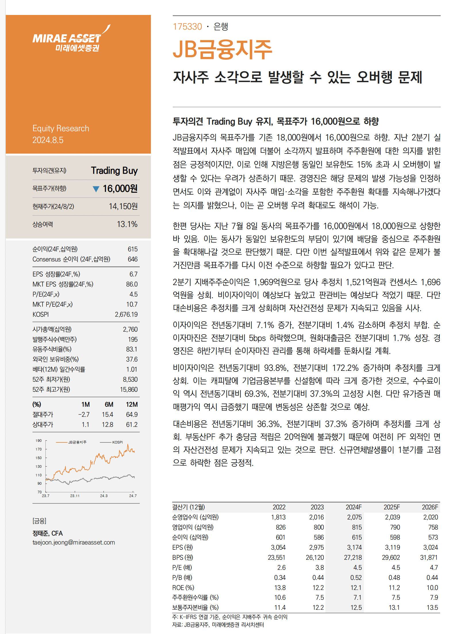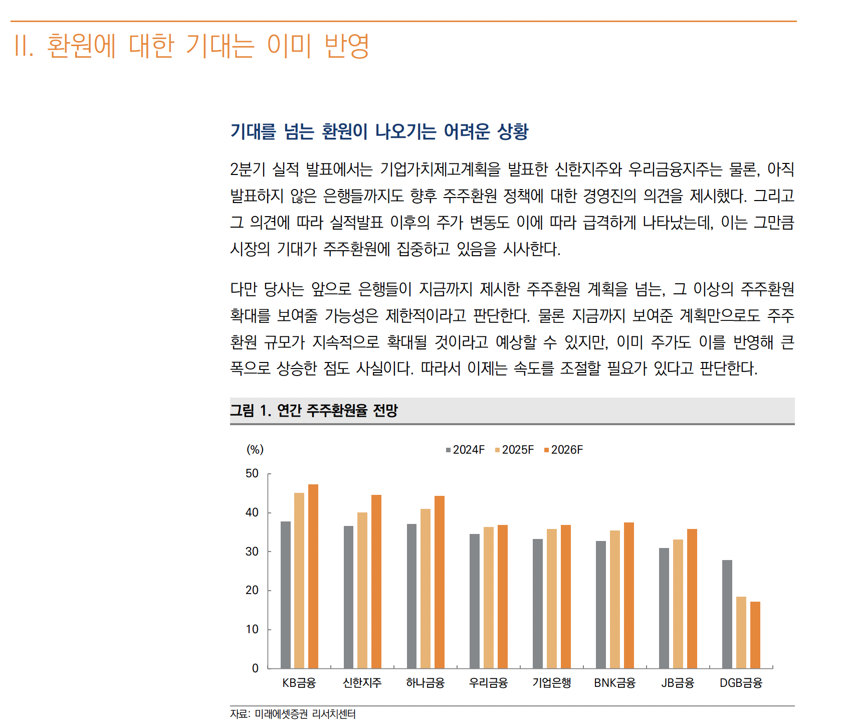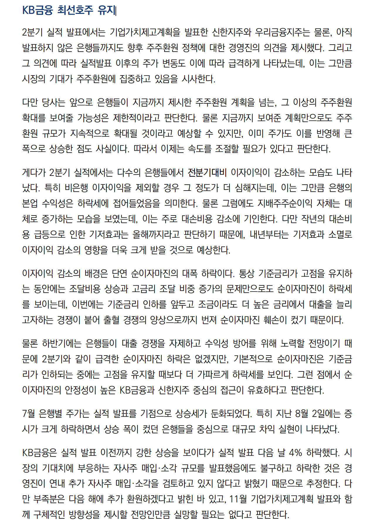 - 2분기 실적 발표에서는 기업가치제고계획을 발표한 신한지주와 우리금융지주는 물론, 아직 발표하지 않은 은행들까지도 향후 주주환원 정책에 대한 경영진의 의견을 제시