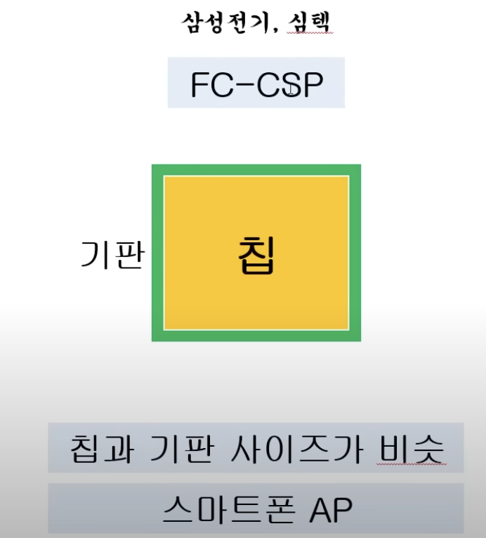 FC의 종류에는 FC-CSP, FC-BGA, FC-BOC가 있습니다. 그중 FC-CSP는 칩과 기판 사이즈가 비슷해 부품 크기가 제하되는 스마트폰 AP 패키징에 주로 사용되고, 주요 생산처는 삼성전기와 심텍이 있습니다.