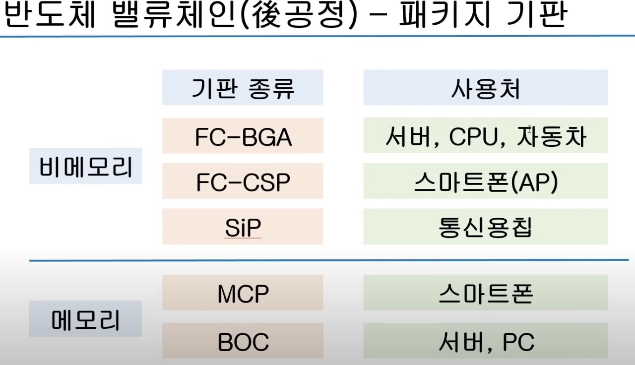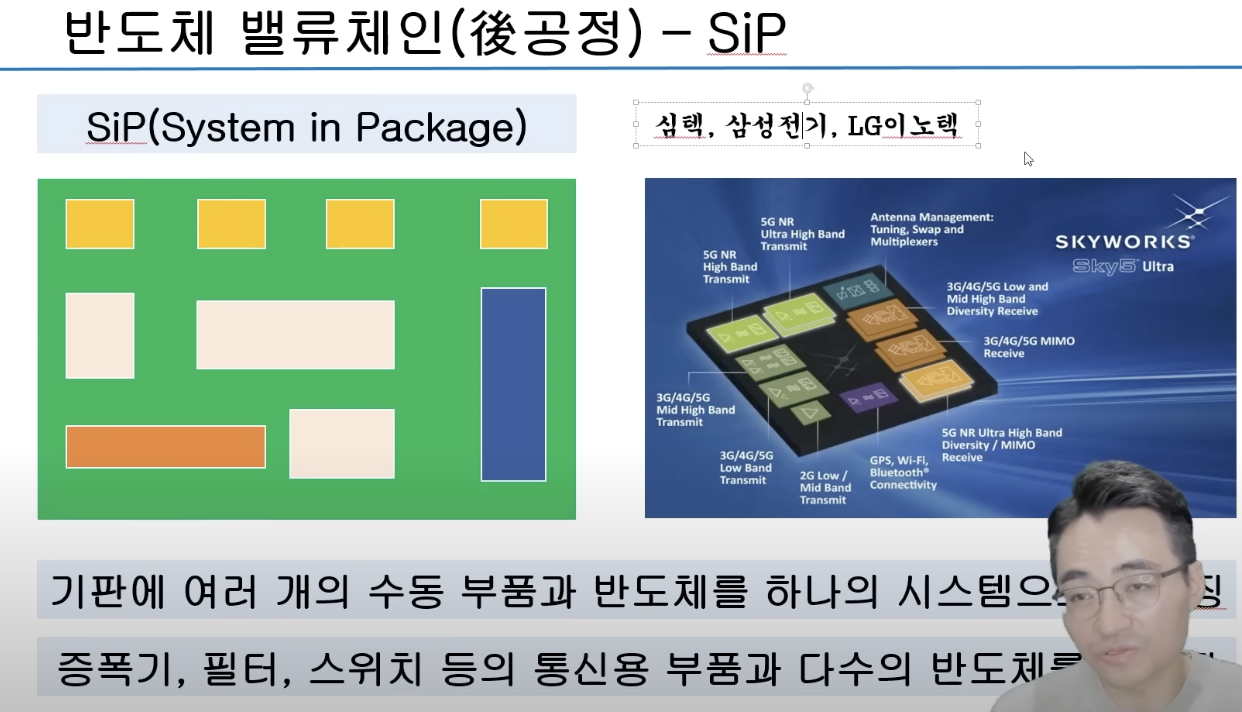 | SiP (System in Package) | 스마트폰에 주로 채택되는 것으로 기판에 여러개의 수동 부품과 반도체를 하나의 시스템으로 패키징 - 심텍, 삼성전기, LG이노텍 |