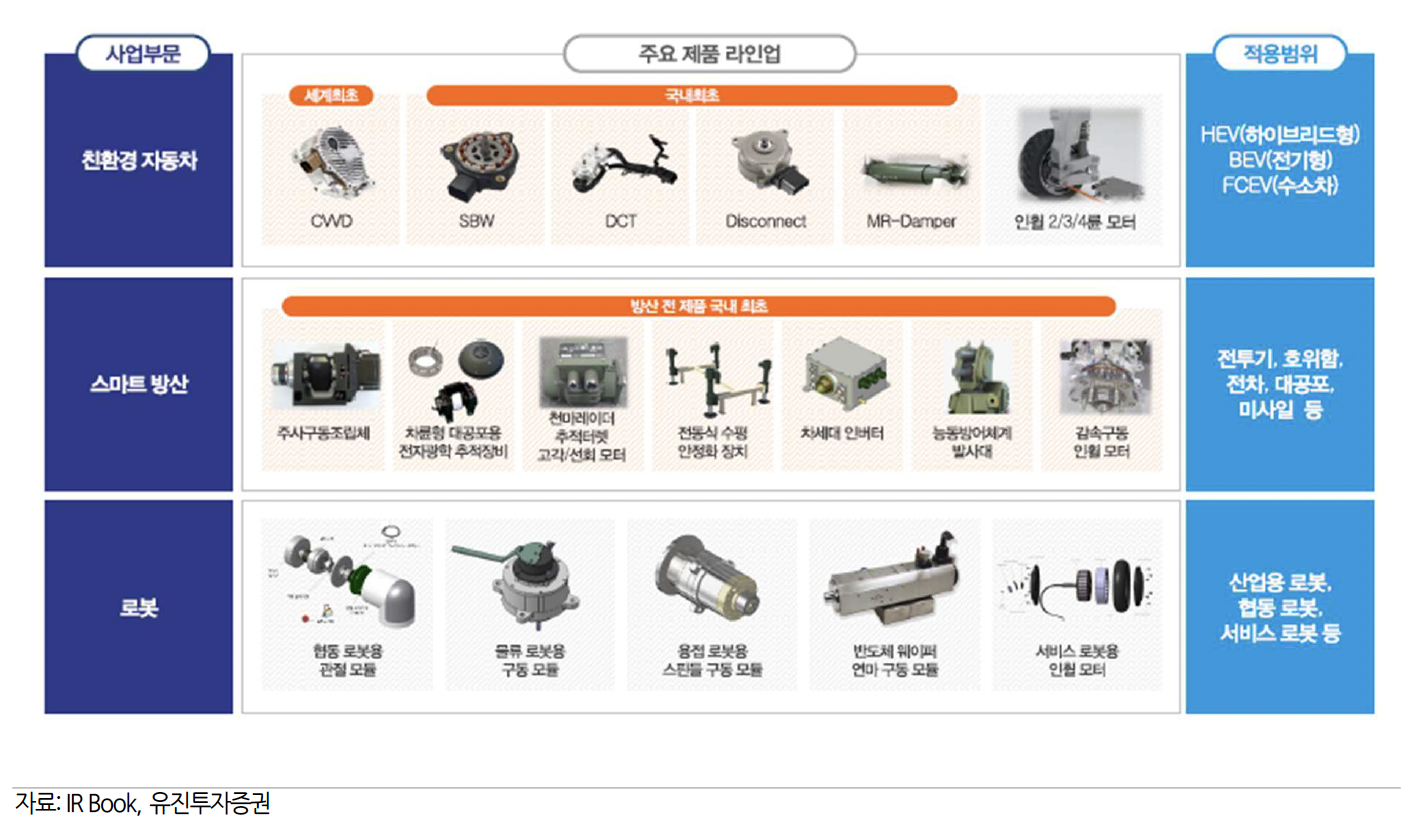 주요 사업 부문은 친환경 자동차, 스마트방산, 로봇이 있고, 매출 비중은(20023년 기준) 자동차 92.7%, 스마트 방산 6.9%,