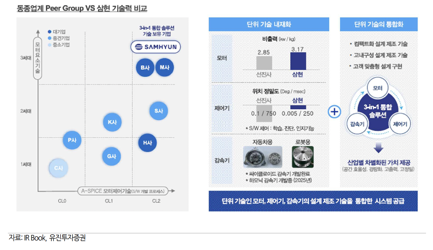1988년 설립된 삼현은 모터, 제어기, 감속기 제품과 이를 모듈화 및 통합화한 3-in-1 엑추에이터를 제조판매하는 기업으로 자동차 전장부품, 무인화 방산, 지능형 로봇 등의 관절모터, 구동시스템 등에 공급 중입니다. 기계를 작동시키는 기본인 모터, 제어기, 감속기를 합한 통합제품으로 경쟁사와 대비해 더 낮은 가격에 생산할 수 있습니다.