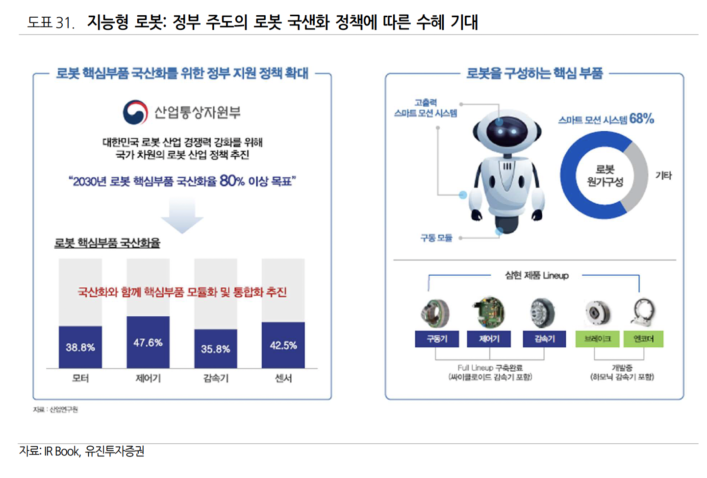 로봇 산업 부문에서는 산업용 로봇과 협동 로봇에 대한 니즈가 증가하고 있습니다. 특히 로봇의 핵심인 모터, 제어기, 감속기를 통합한 3-in-1 설루션 제품으로 로봇의 움직임을 정밀하고 효율적으로 구동 및 제어할 수 있습니다. 이런 기술을 기반으로 로봇용 관절모터와 스마트 로봇 체어용 구동모터 개발에 성공하였습니다.
