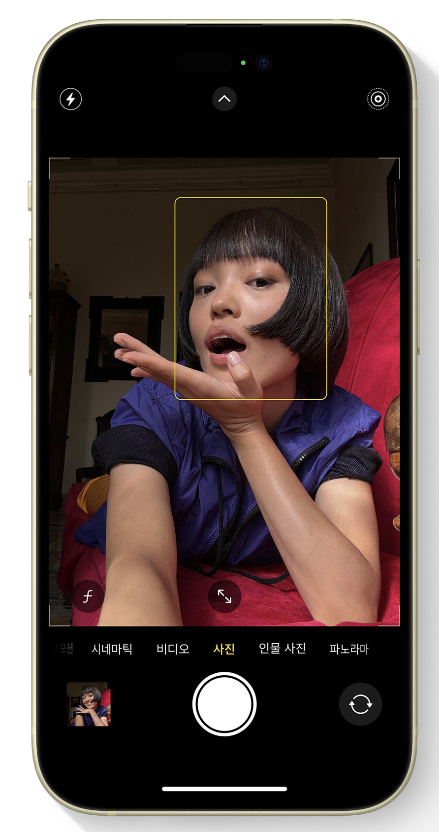 사진을 찍는 중에도 촬영 후에도 원하는 인물을 탭하여 초점을 다른 피사체로 옮길 수 있습니다. 그리고, 인물 사진 모드로 전환하지 않아도 사람 혹은 강아지 , 고양이 같은 반려동물인 경우 아이폰15가 자동으로 심도를 조정합니다.