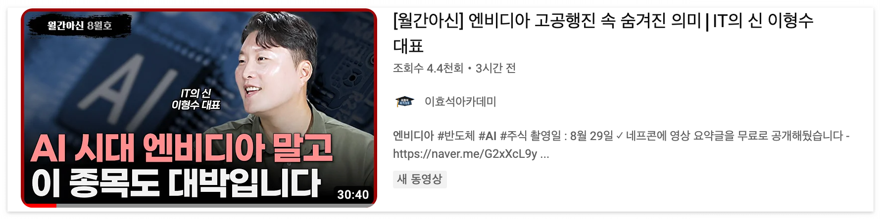 좋은 영상이 있어 공유해드립니다. 이효석 아카데미의 월간아신에 IT의 신 이형수 대표님께서 엔비디아와 HBM 수요와 AVP 섹터에 대해 이야기 해주셨네요.