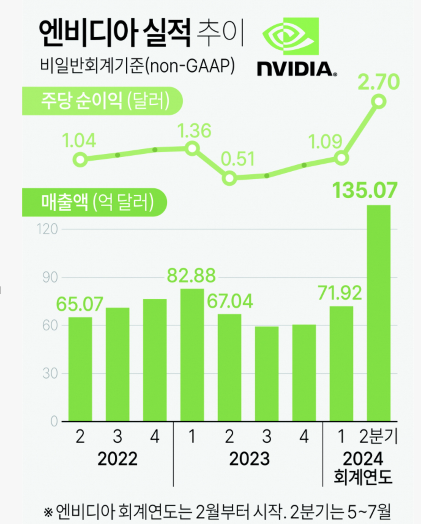 가희 AI 반도체 대장주라고 할 수 있는 엔비디아가 지난 23일 실적을 발표했습니다. 1분기에 이어 2분기도 깜짝 실적으로 2분기 (5~7월) 135억 1000달러(18조 225억원)의 매출과 주당 2.7달러(3604원)의 순이익을 기록했습니다. 이는 월가 전망치 112억2천만달러(14조9787억원)보다 20% 웃돌고, 주당순이익은 전망치보다 30% 상회하는 수준입니다.