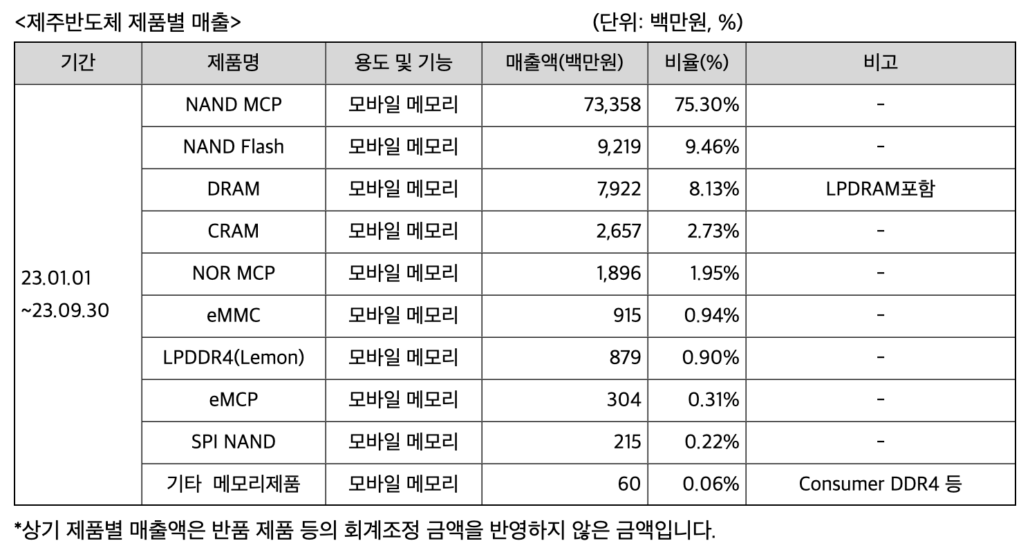 제주반도체는 제주에 본사를 둔 업체로 모바일 응용기기에 적요되는 메모리 반도체를 개발, 제조하여 판매하고 있습니다. 제주반도체는 자체적으로 제조 생산라인을 보유하지 않고, 직접 설계한 제품을 전문 파운드리 회사에 위탁하여 생산하는 팹리스 회사입니다. 주로 저전력, 저 용양의 메모리 (가전, 모바일)를 개발, 제조하고 있습니다.