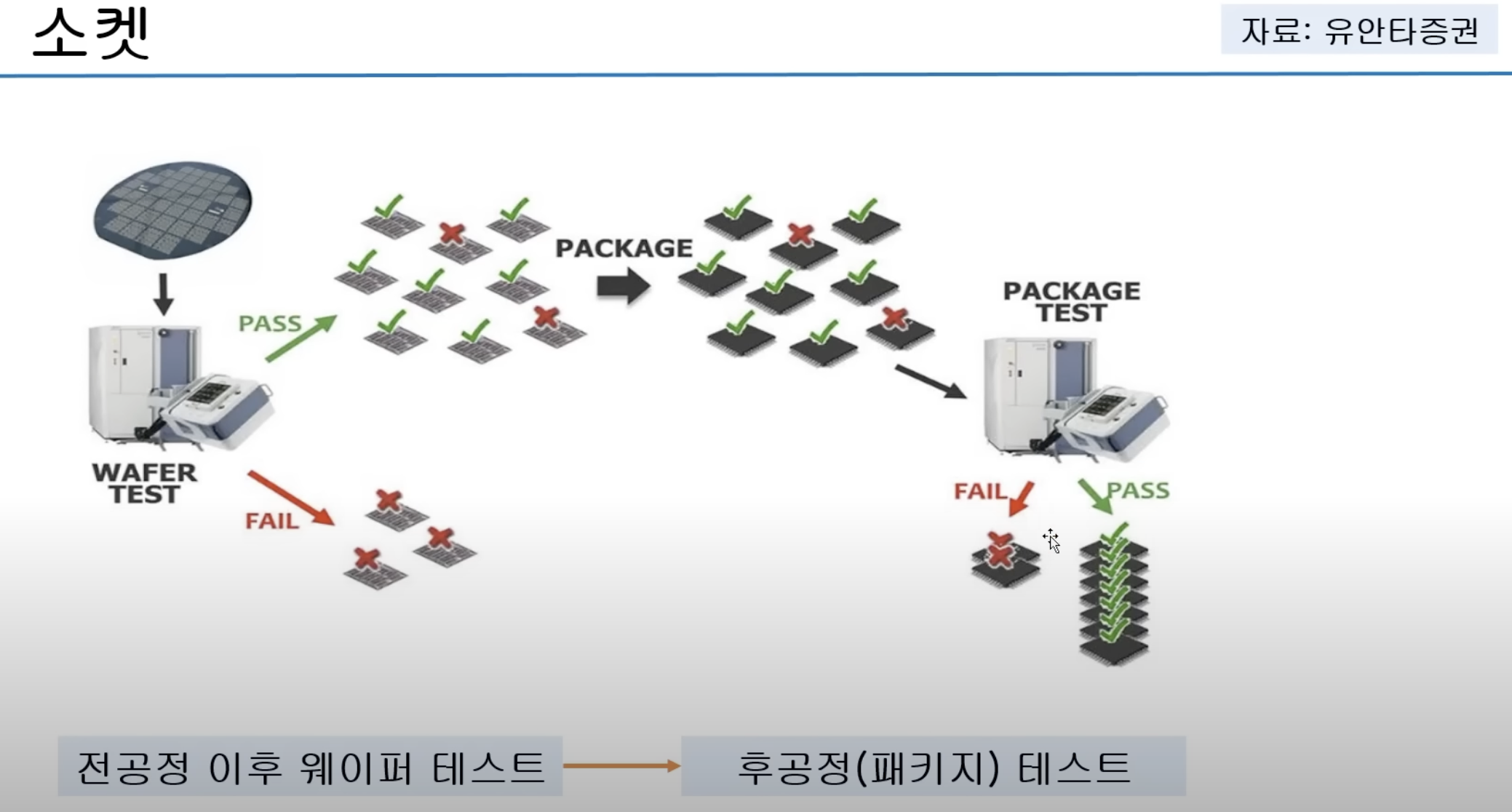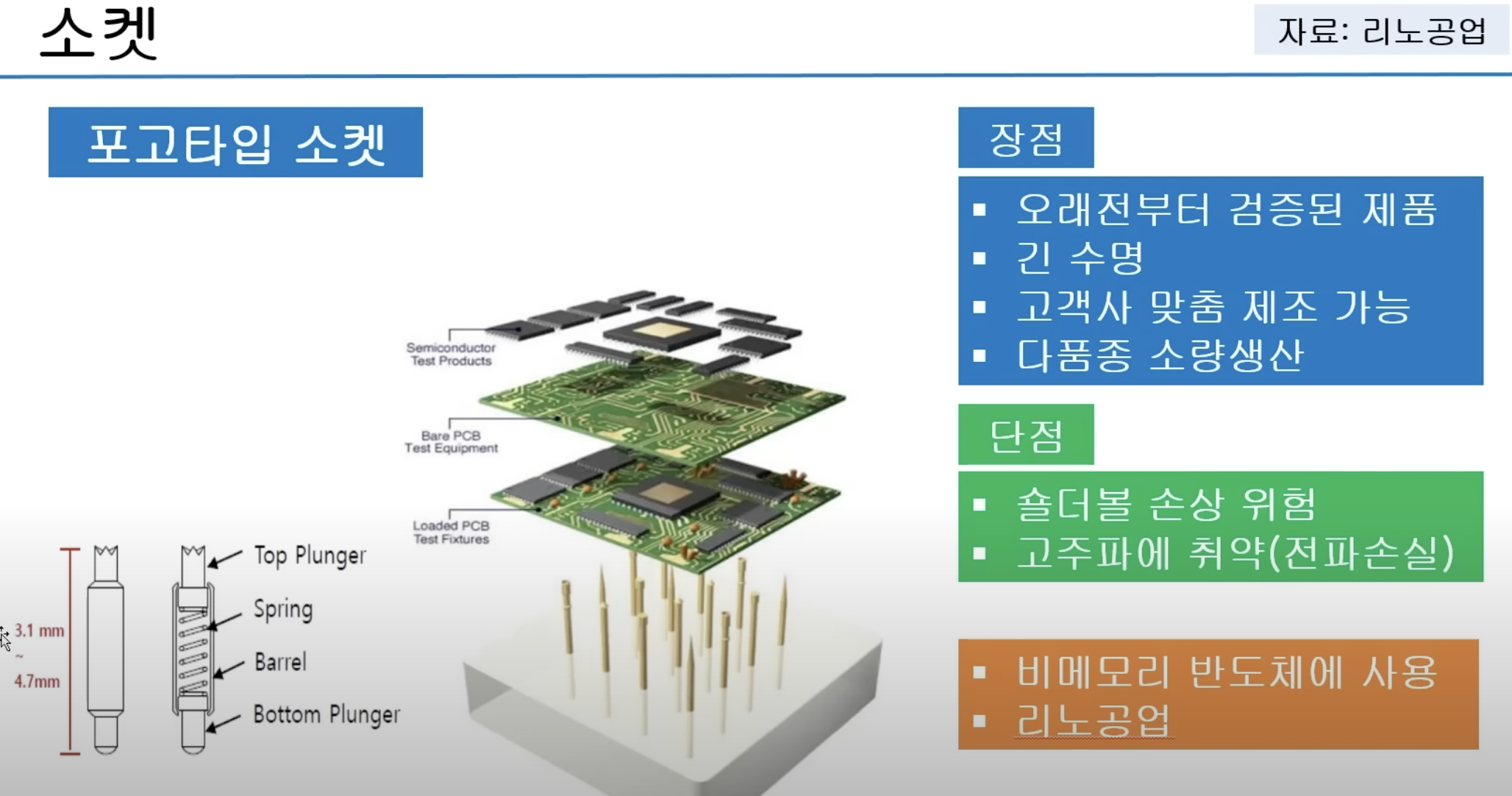테스트 소켓은 패키징을 끝낸 칩을 소켓에 꽂아 전기가 통하는지를 검사합니다. 반도체 테스트는 반도체가 미세화되고 첨단화되면서 점점 더 중요해지고 있고, 반도체 종류가 많으면 소켓도 증가합니다.