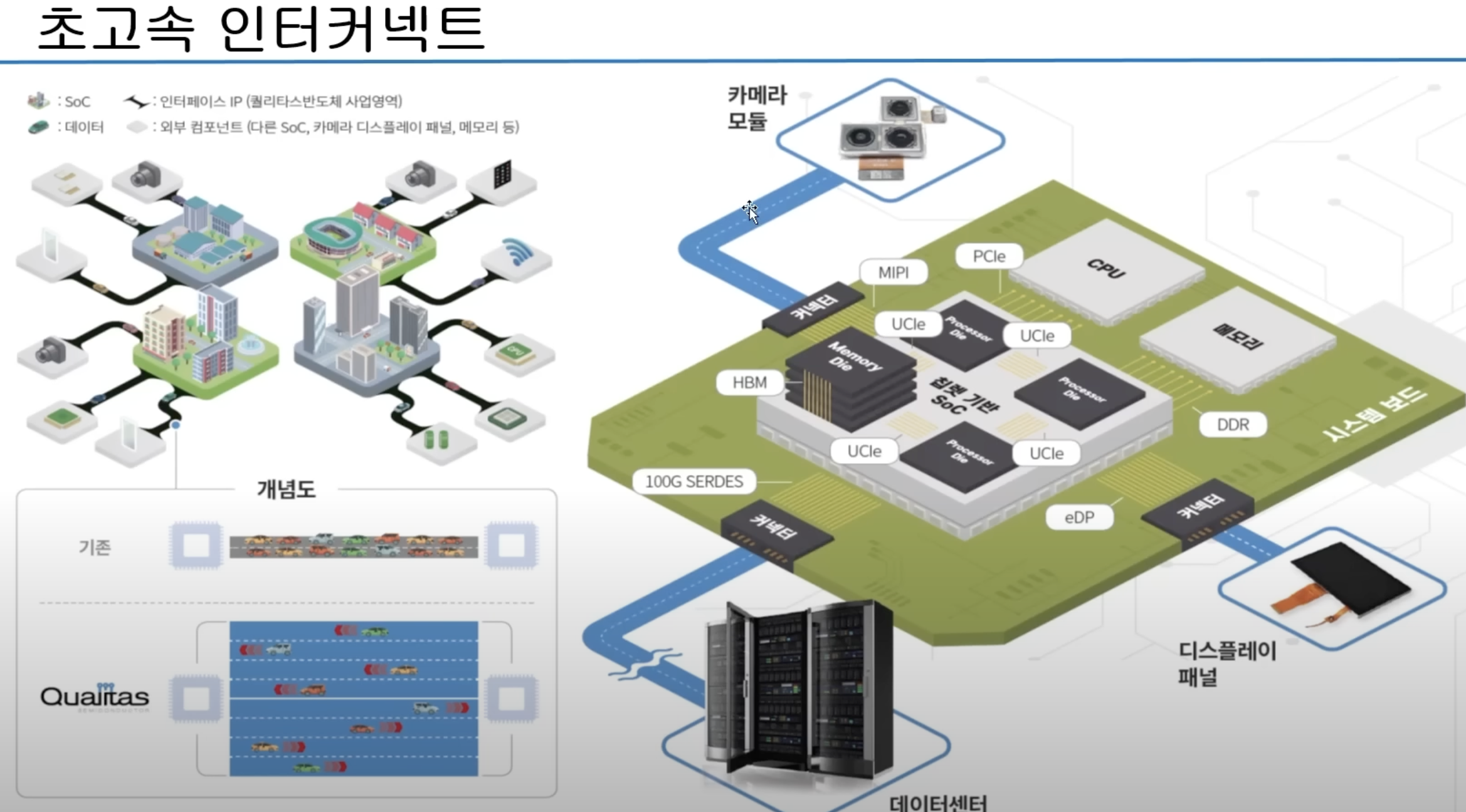 퀄리타스반도체는 초고속 인터페이스 IP 설계 기업입니다. 초고속 인터페이스란 초고속 인터커넥트(상호연결)를 위한 반도체 회로로 AI, 자율주행, 데이터센터, AR/VR 등 복잡하고 방대한 양의 데이터 연산에 필요한 초고속 인터커넥트 설루션 인터페이스 IP를 제공합니다.