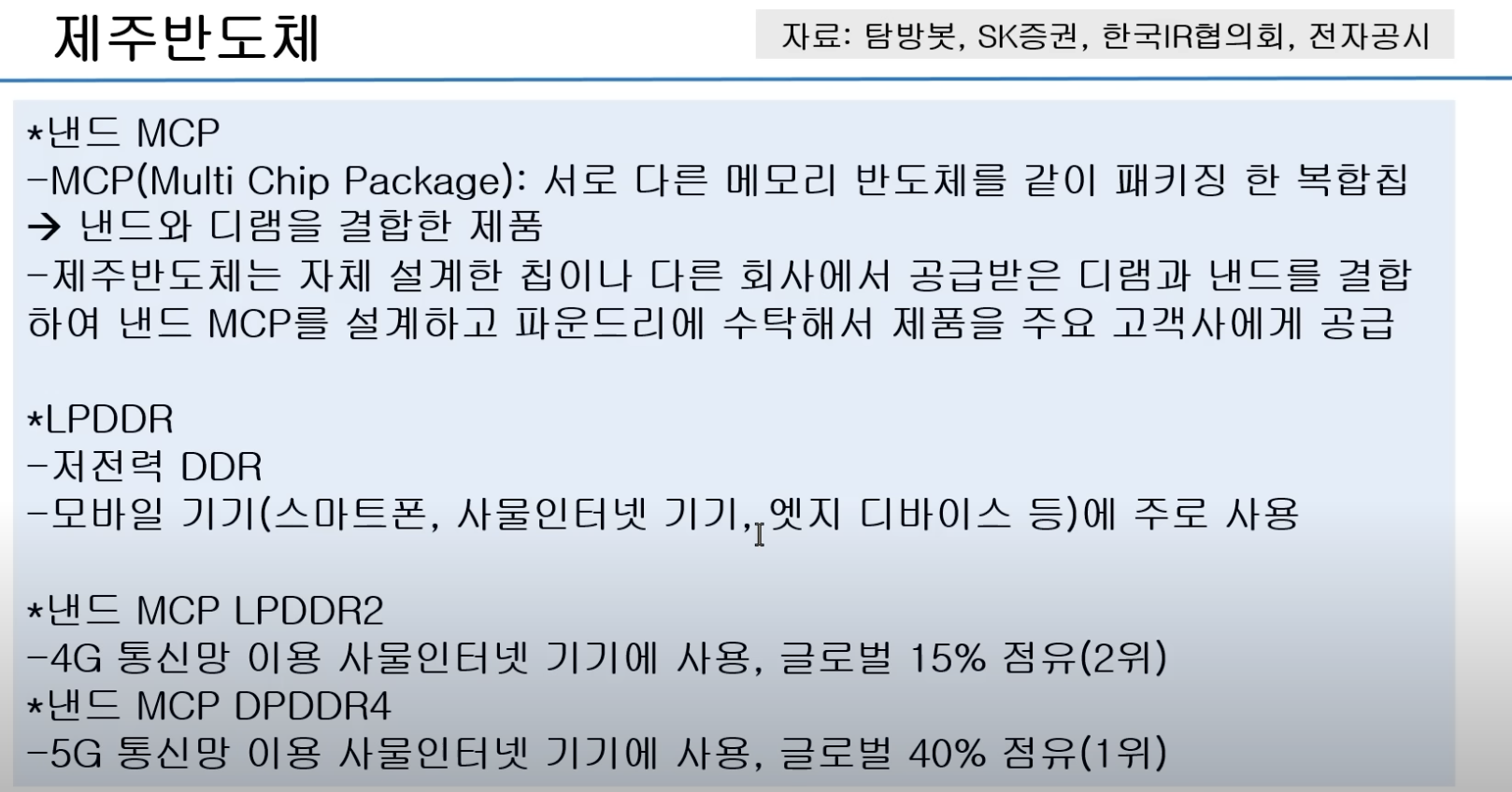 5G 사물인터넷 시장 기준 마이크론이 50%, 제주반도체가 30~40%로 독과점을 형성하고, 퀄컴, 미디어택 5G 사물인터넷 칩셋용 저전력 메모리 반도체 인증업체로 마이크론, 제주반도체가 유일합니다. 사물인터넷 기기, 에지 디바이스 기기 등 교체 주기가 길고 수요가 안정적인 분야인데 차량용 반도체 비중도 증가세여서 글로벌 자동차 전장업체 협력사로 등록되어 있습니다. 차량용 반도체 비중은 10%까지 상승 전망입니다.