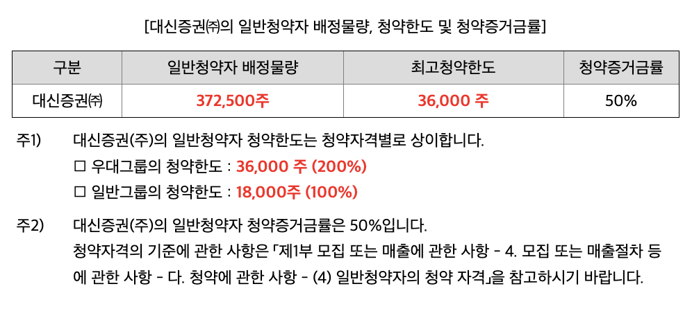 • 최고청약한도 : 우대그룹청약한도 36,000주 (200%) / 일반그룹 청약한도 18,000주 (100%)