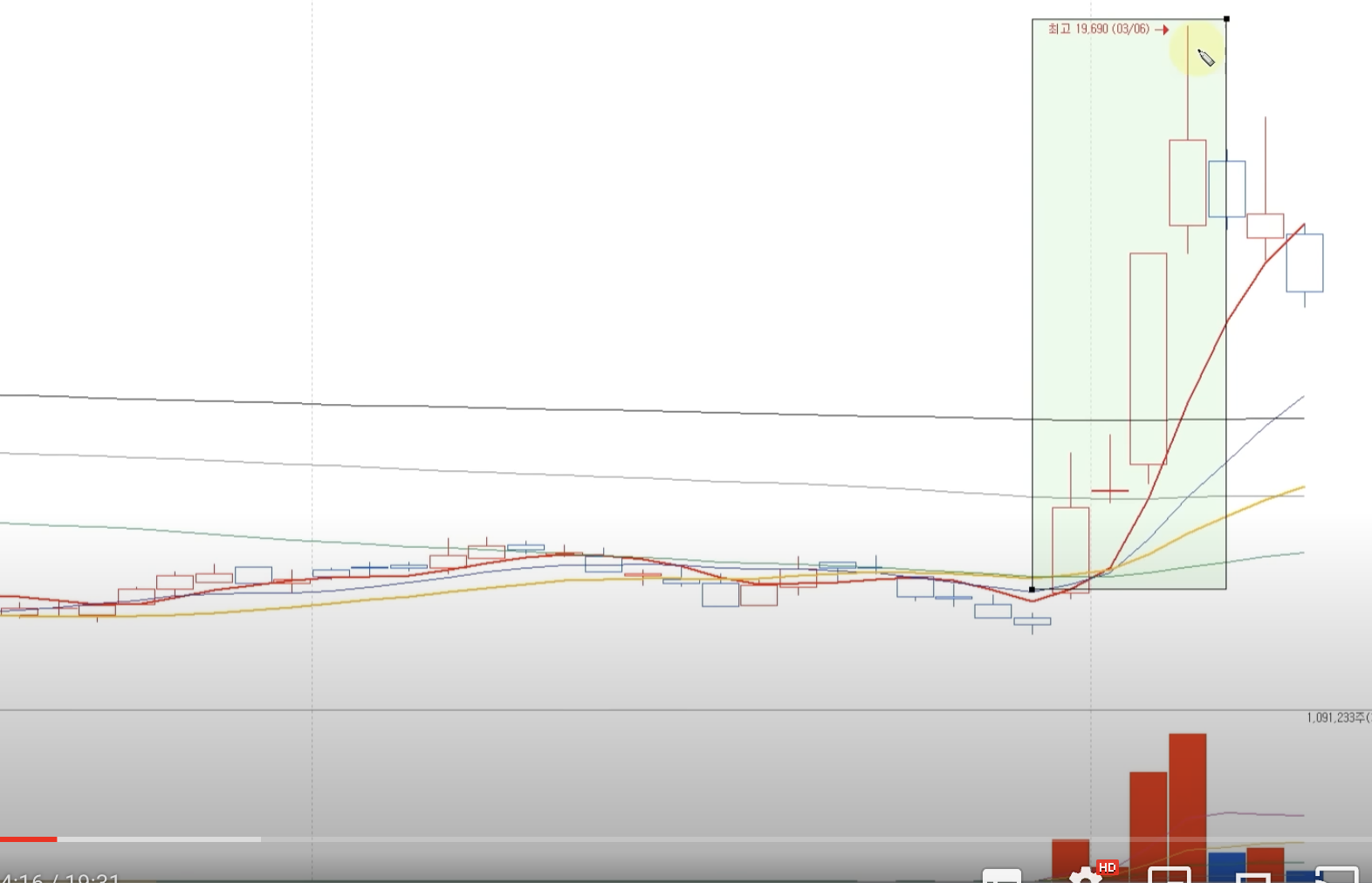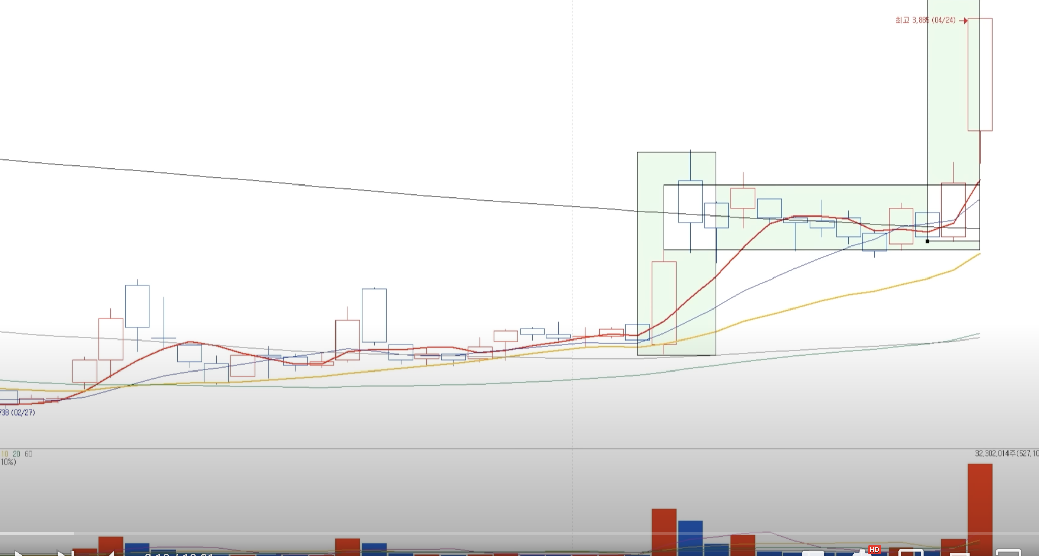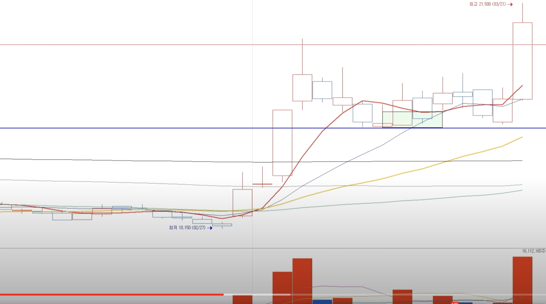 1. 대량의 거래량과 함께 장대양봉이 생김