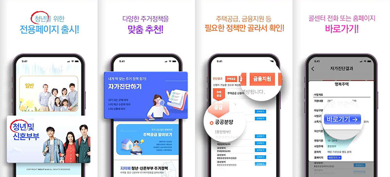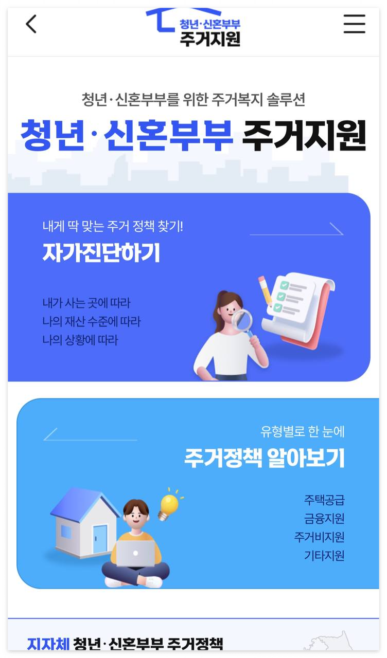 그동안 청년이나 신혼부부 등의 주거정책을 보려면 이곳저곳에 분산되어 찾기가 쉽지 않았던 것 같습니다. 하지만 이젠 스마트폰이나 온라인으로 쉽게 찾아보실 수 있는 마이홈이 청년・신혼부부 전용 페이지도 신설해 자가 진단을 통해 맞춤형 정책을 추진하고 지자체 등의 청년 주거정책을 통합 제공합니다.