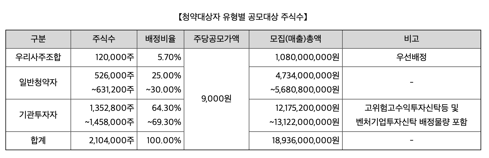 | 주간사 | 최소 청약 수 | 최소 청약 증거금 |