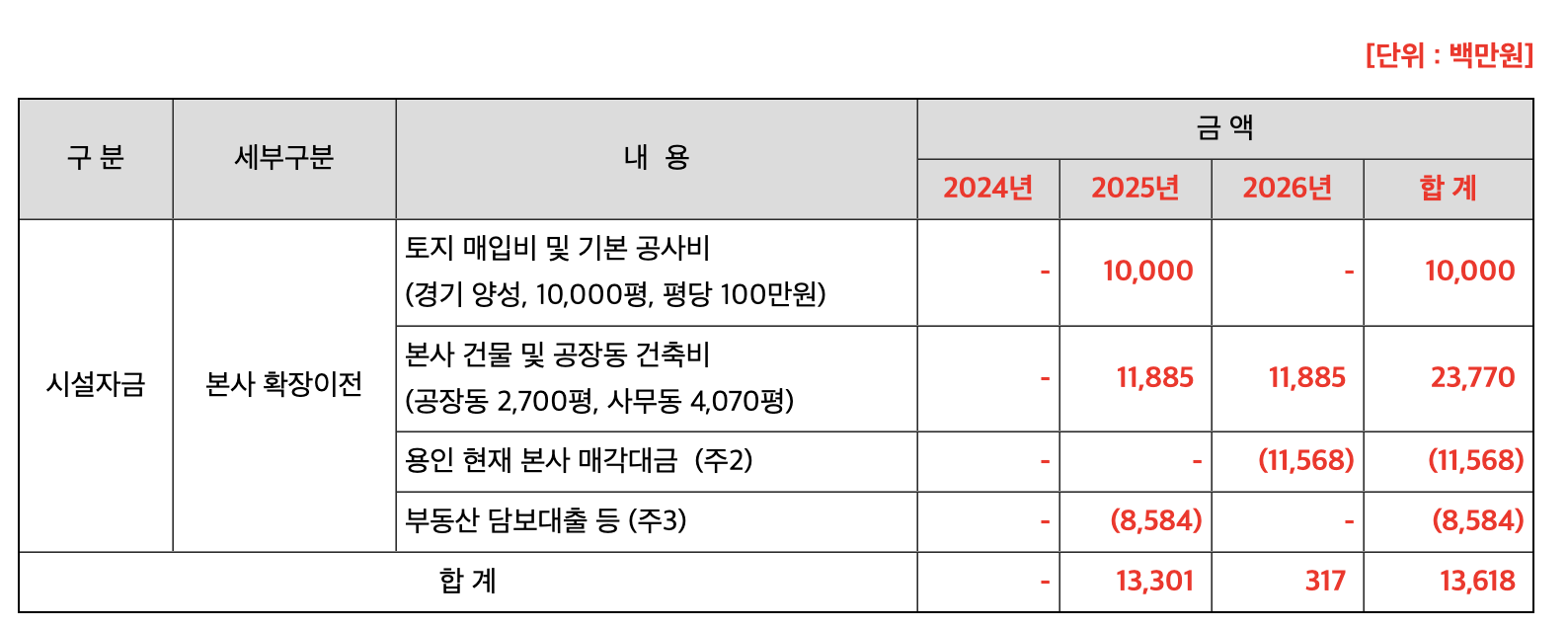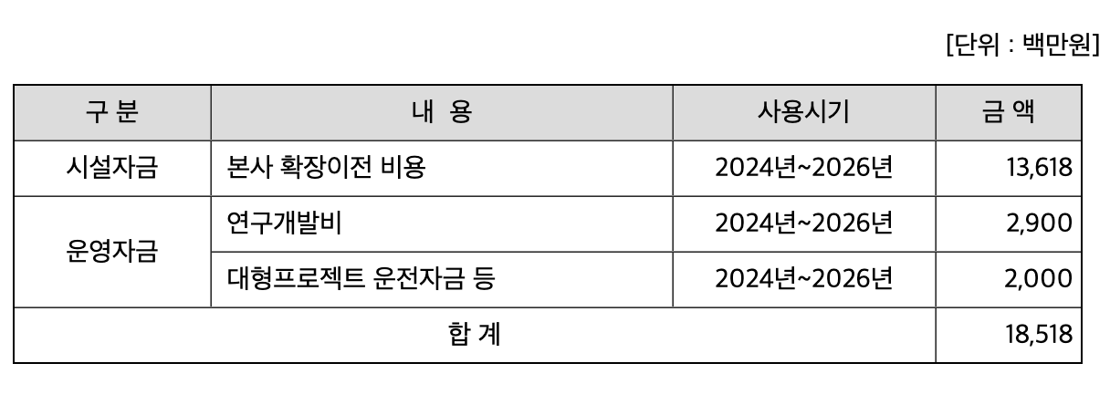 자금은 향후 3년간 크게 3부분으로 나누어 사용할 예정입니다. 첫 번째는 시설자금으로 본사 확장이전 비용으로 두 번째는 운영자금으로 연구개발비로, 세 번째는 대형프로젝트 운전자금으로 사용할 예정입니다.