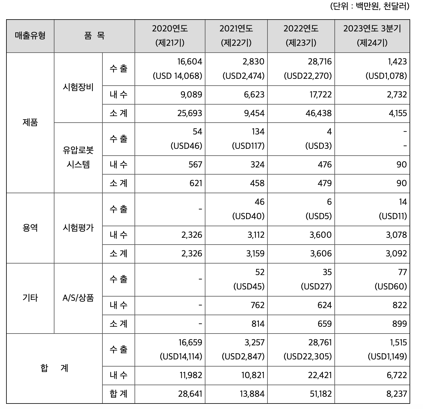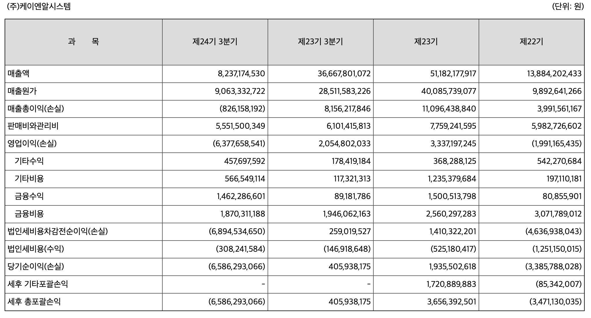 케이엔알시스템의 작년 3분기 매출액은 82억으로 전년대비 감소했고, 영업이익도 63억 손실, 당기순손실이 65억 인 적자상태입니다. 22년의 경우 매출이 증가했는데, 23년엔 매출이 감소했습니다. 23년도의 수익성 악화의 원인은 신규 고사양 제품 개발에 따른 연구개발비의 발생 때문이라고 합니다. 6축 진동내구시험기 개발 및 납품 과정에서 약 10억 원의 일회성 개발비가 집행되었다고 합니다.