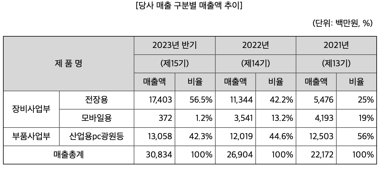삼성전기는 MLCC, 칩인덕터, 칩저항을 생산하는 컴포넌트 사업 부분, 카메라모듈, 통신모듈을 생산하는 광학통신솔루션 사업부분, 반도체패키지기판(PCB)을 생산하는 패키지설루션 사업부문의 총 3개의 사업부문으로 구성되어 있습니다.